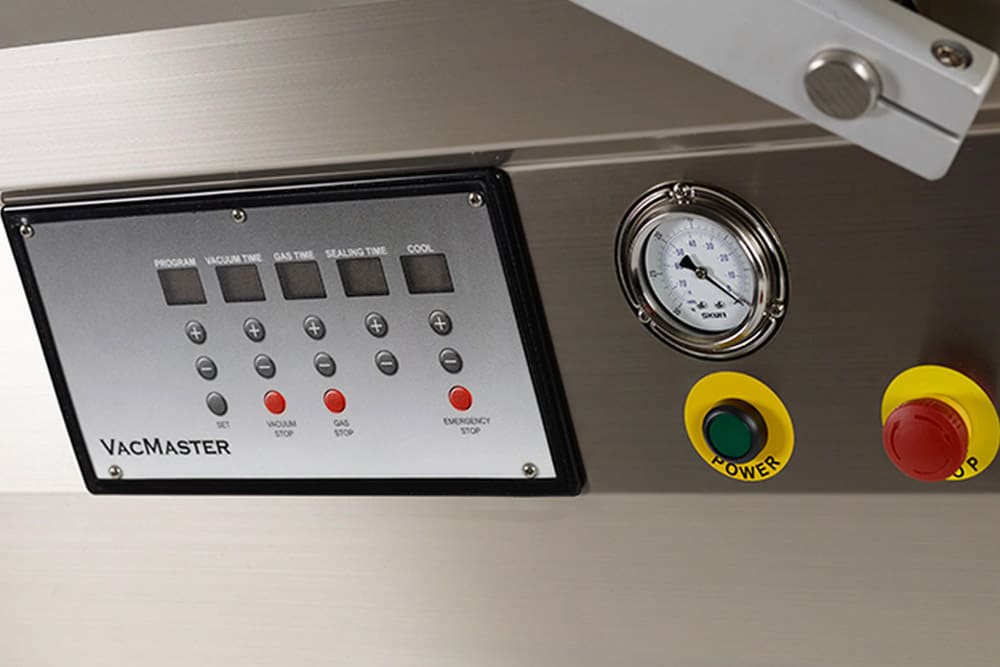 Our smaller machines have a control unit with the basic settings. The plug- and-play design of the machines makes installation easy and does not require any adjustments in 90% of the situations. For special packaging requirements the machine offers the flexibility to adjust sealing time and vacuum time. The vacuum time can be set and the vacuumlevel reached can be monitored with the vacuum meter.
